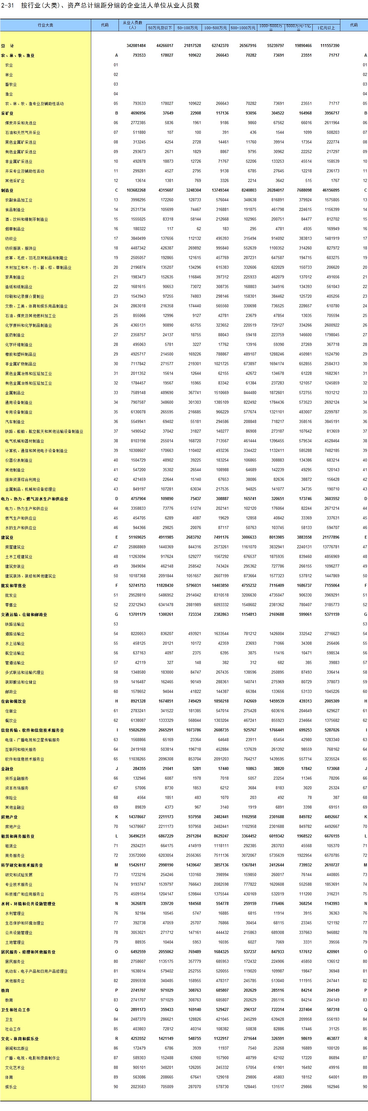 2-31 按行业(大类)、资产总计组距分组的企业法人单位从业人员数