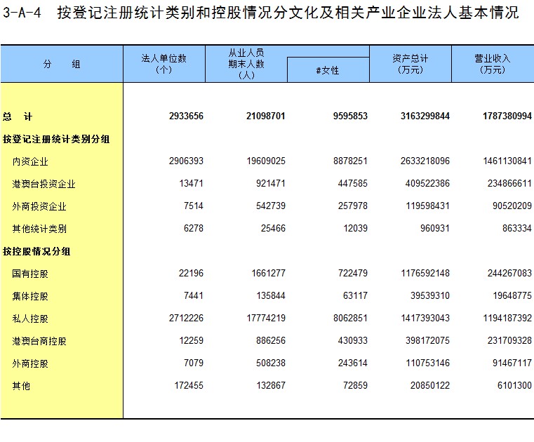 3-A-4 按登记注册统计类别和控股情况分文化及相关产业企业法人基本情况