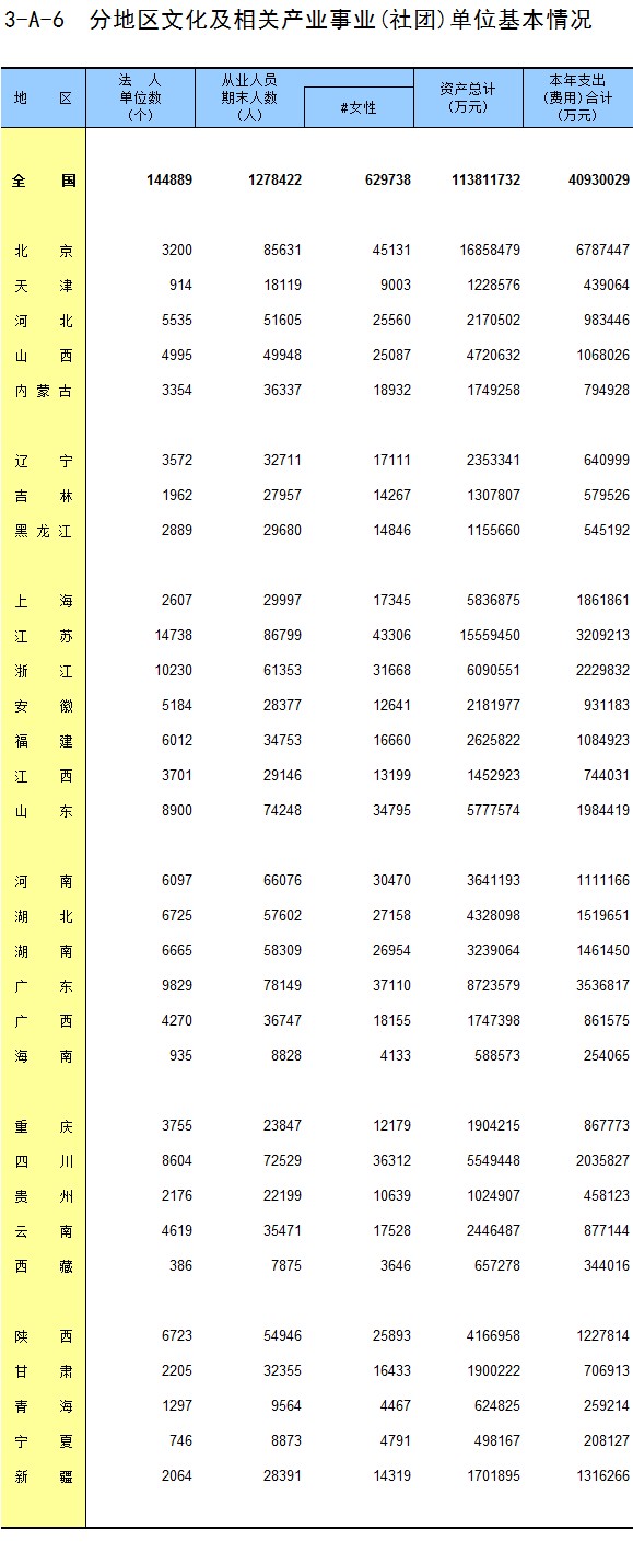 3-A-6 分地区文化及相关产业事业(社团)单位基本情况