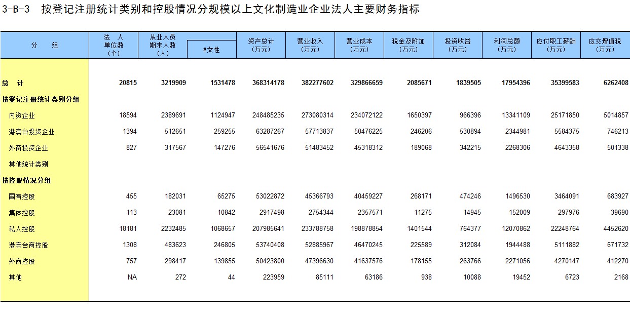 3-B-1 按登记注册统计类别和控股情况分文化制造业企业法人主要财务指标