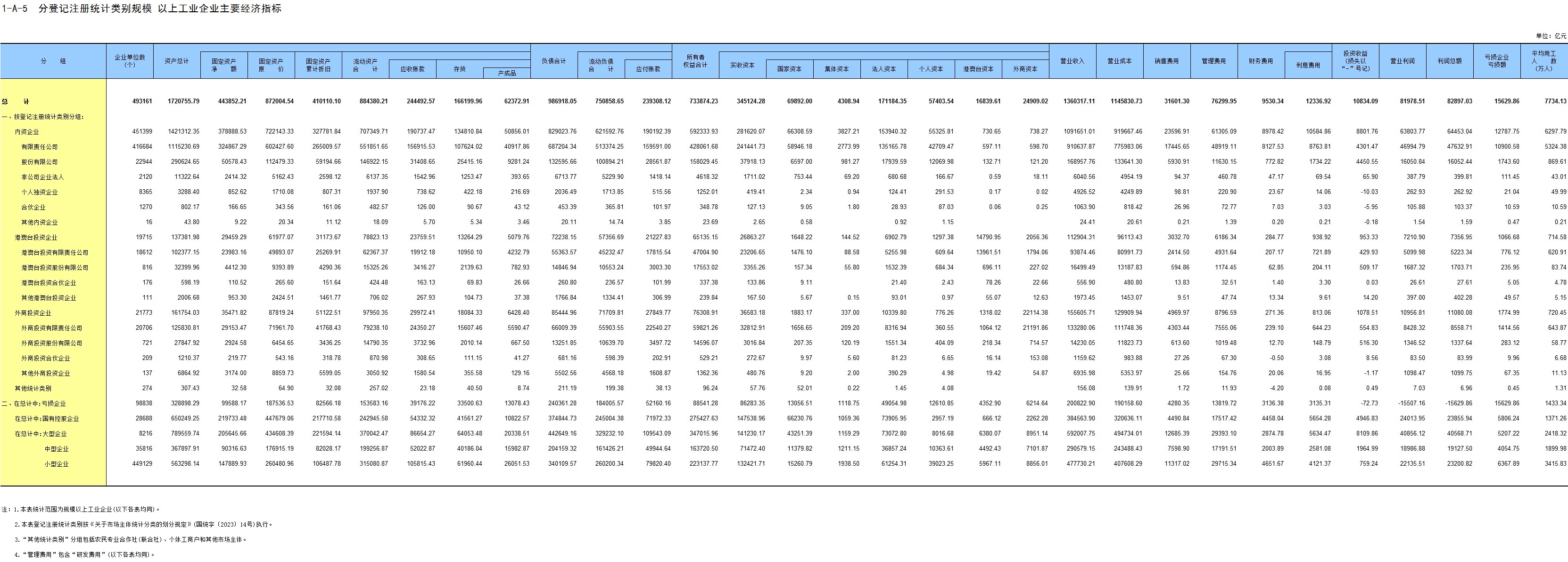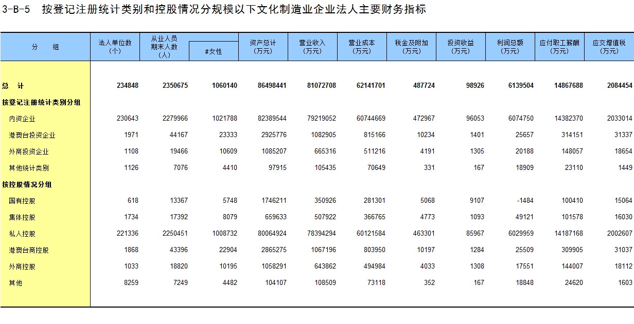 3-B-5 按登记注册统计类别和控股情况分规模以下文化制造业企业法人主要财务指标