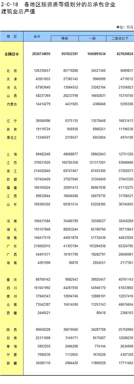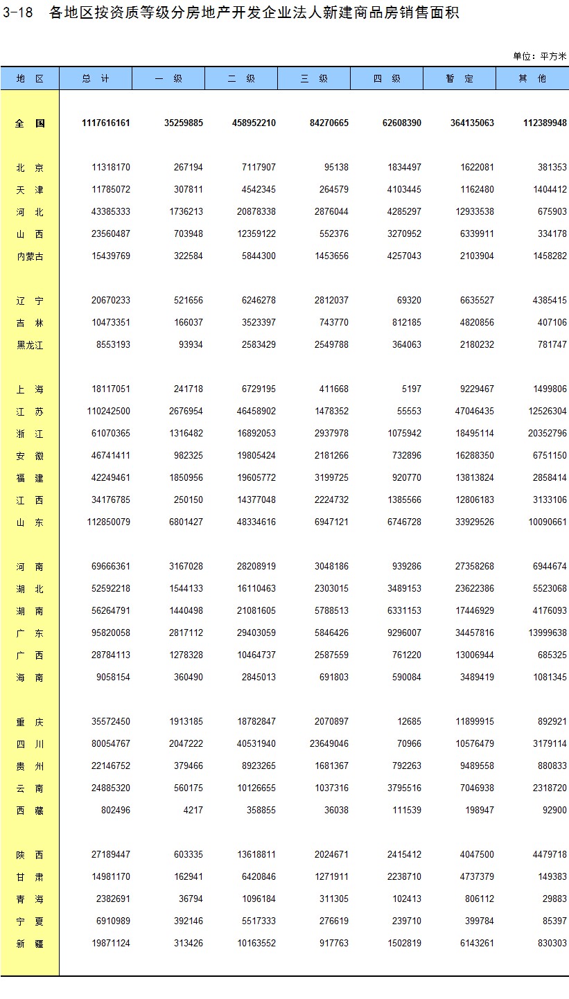 3-18 各地区按资质等级分房地产开发企业法人新建商品房销售面积