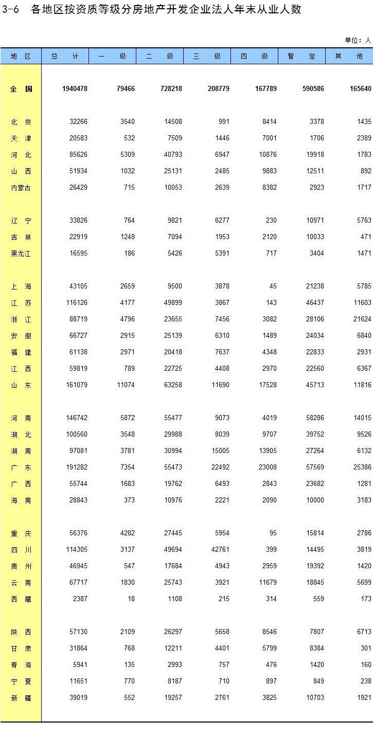 3-6 各地区按资质等级分房地产开发企业法人年末从业人数