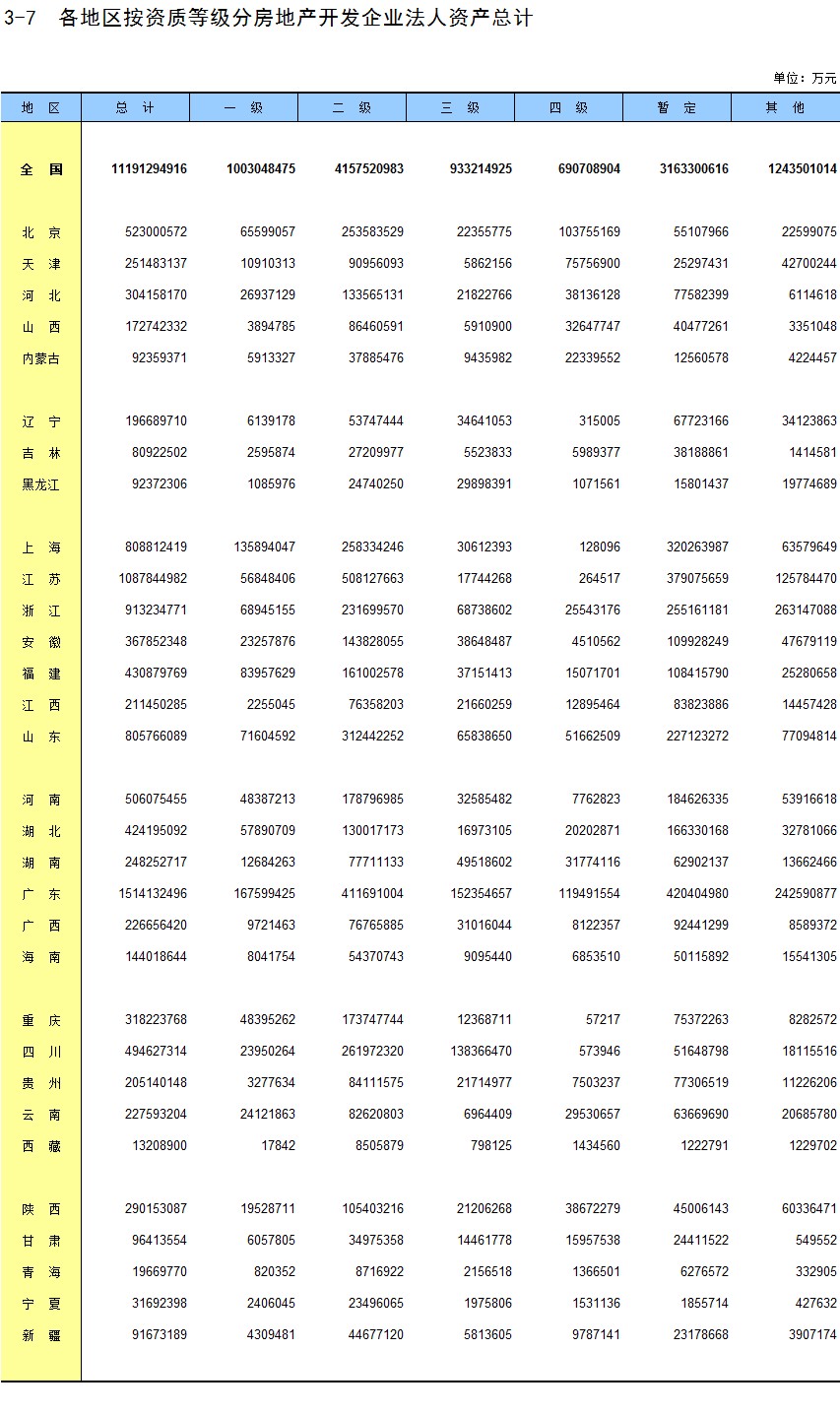 3-7 各地区按资质等级分房地产开发企业法人资产总计
