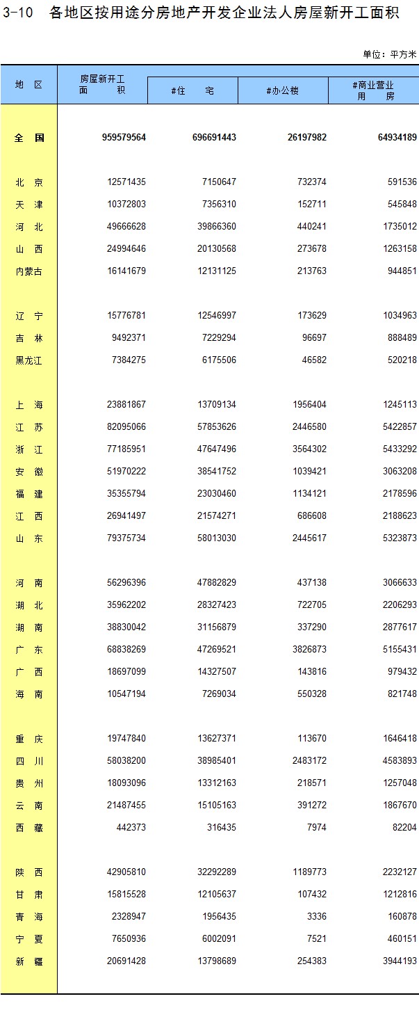 3-10 各地区按用途分房地产开发企业法人房屋新开工面积