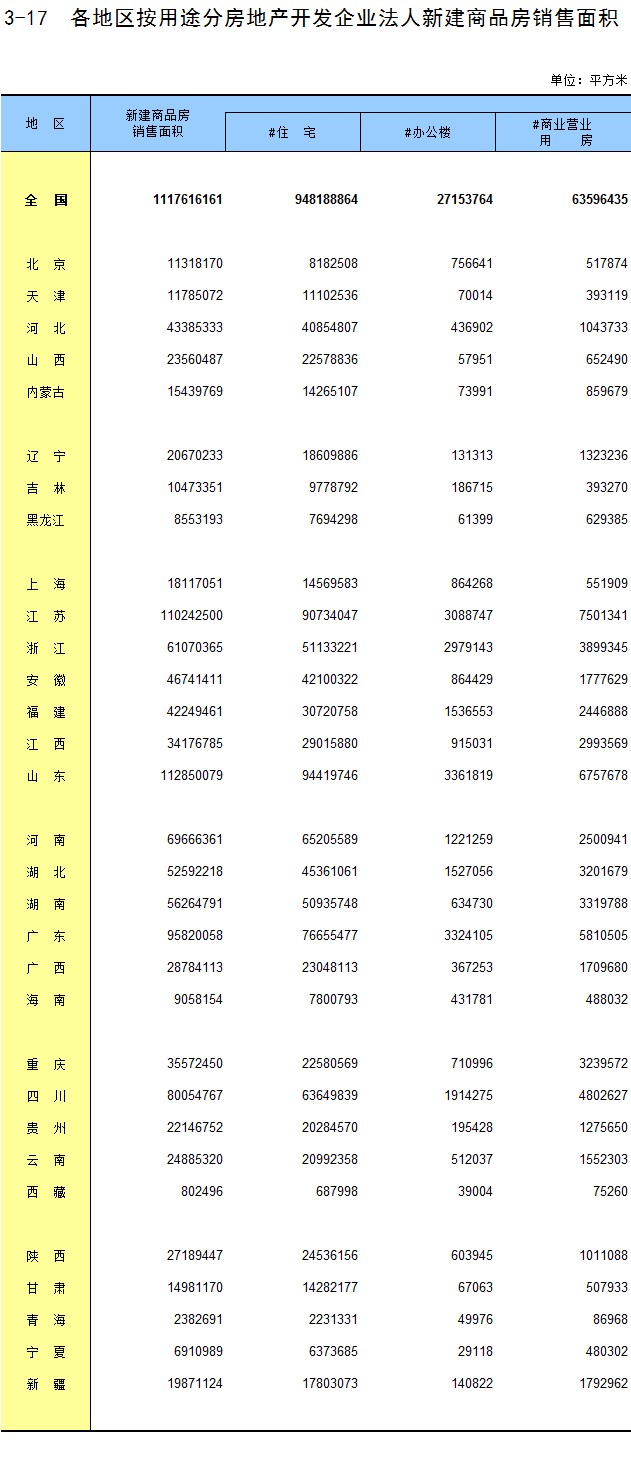 3-17 各地区按用途分房地产开发企业法人新建商品房销售面积