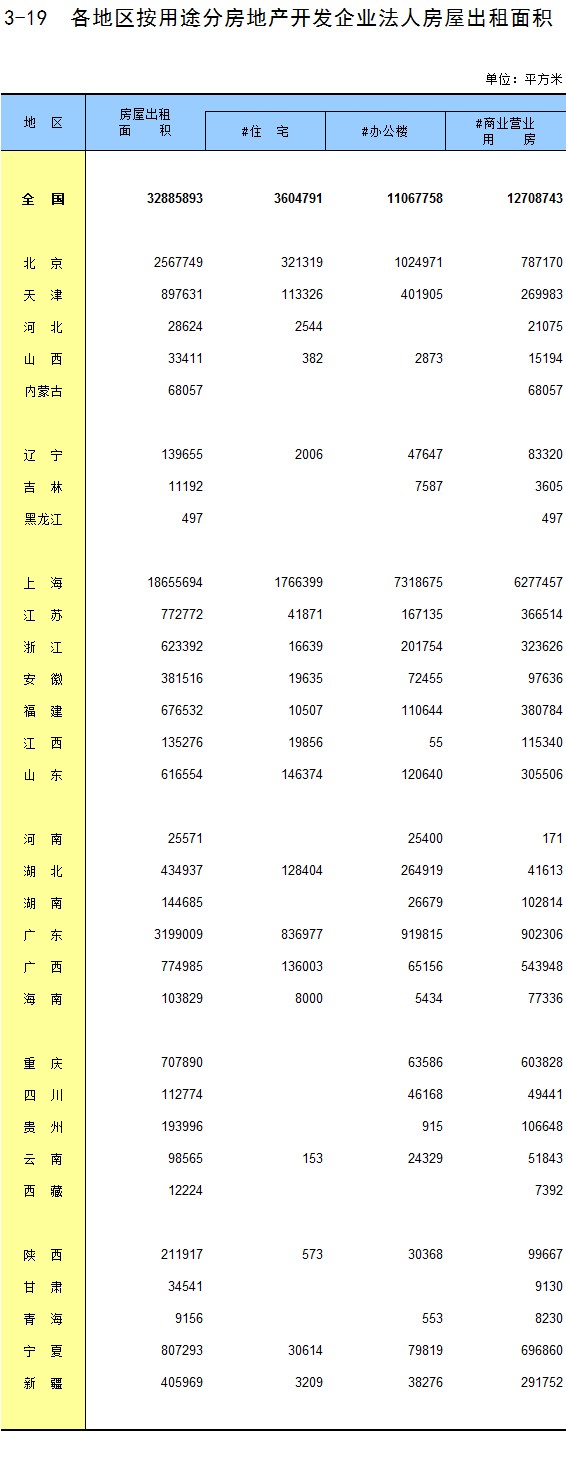 3-19 各地区按用途分房地产开发企业法人房屋出租面积