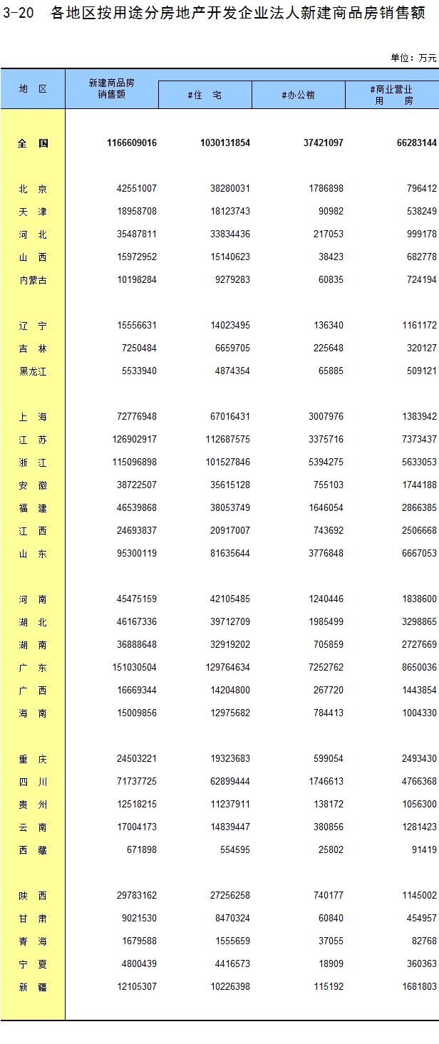 3-20 各地区按用途分房地产开发企业法人新建商品房销售额