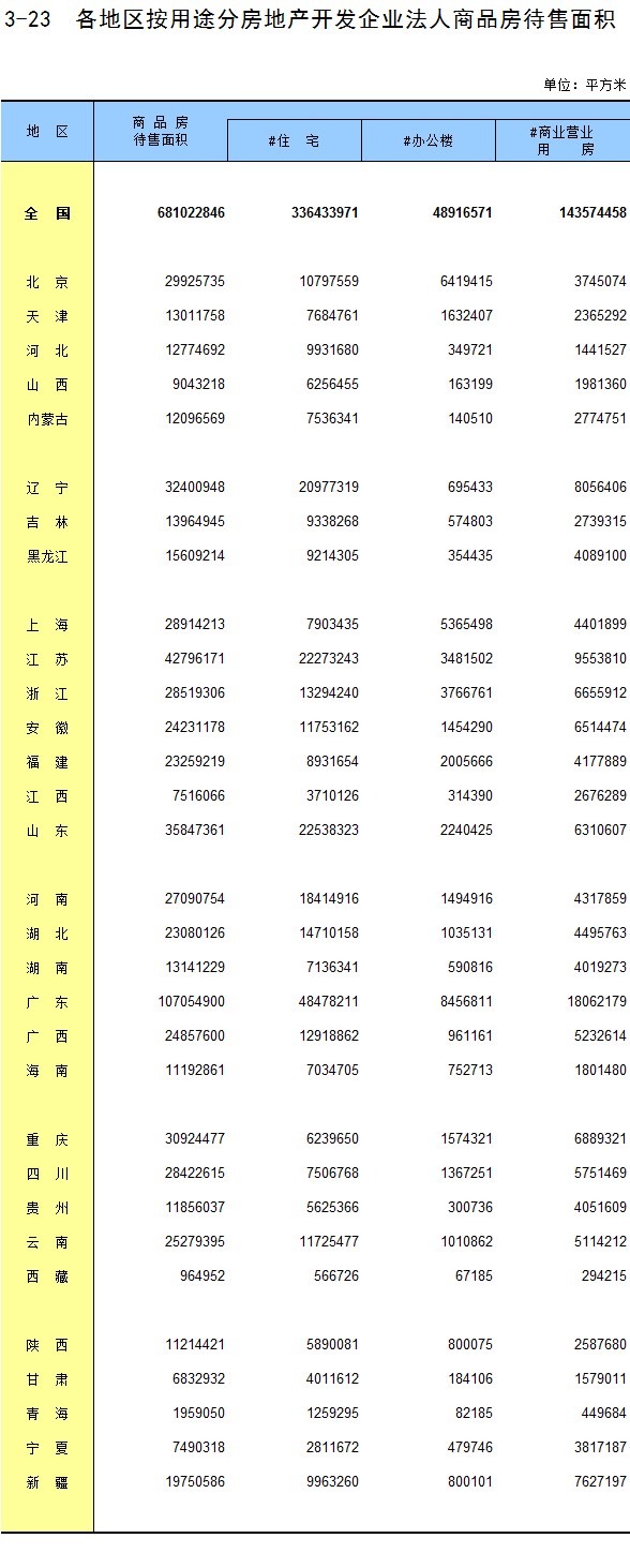 3-23 各地区按用途分房地产开发企业法人商品房待售面积
