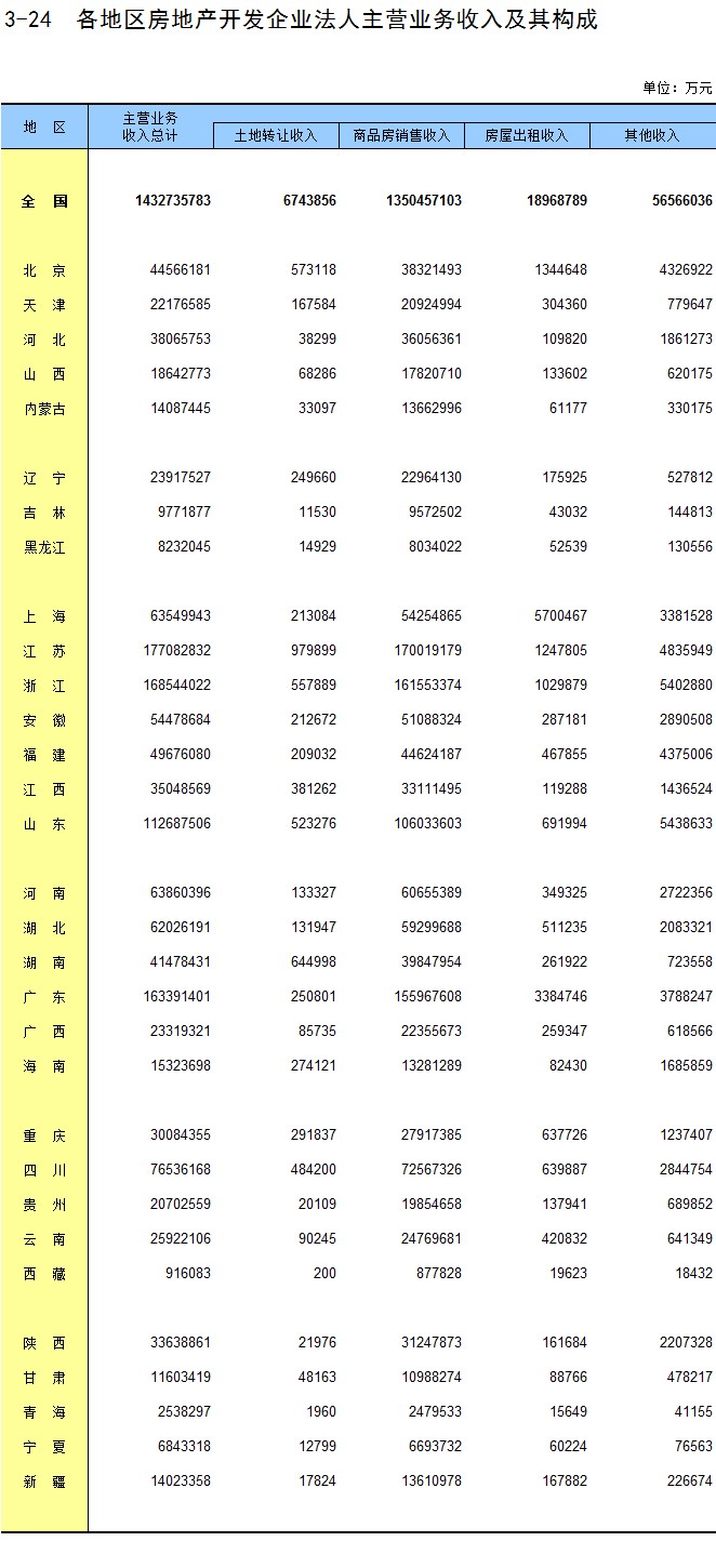 3-24 各地区房地产开发企业法人主营业务收入及其构成