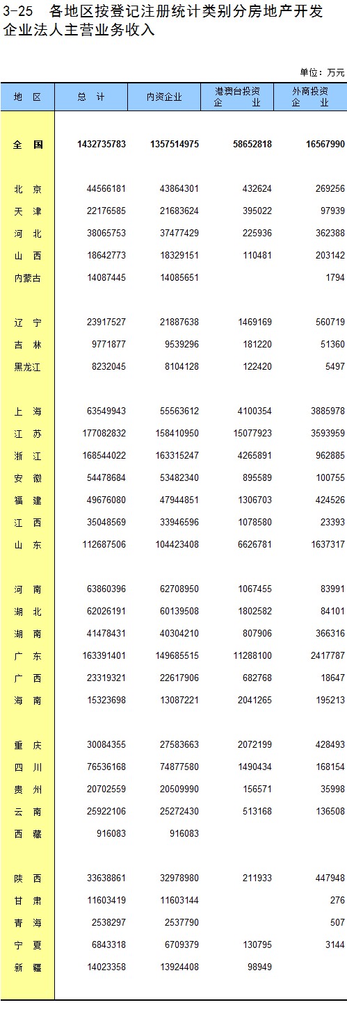 3-25 各地区按登记注册统计类别分房地产开发企业法人主营业务收入