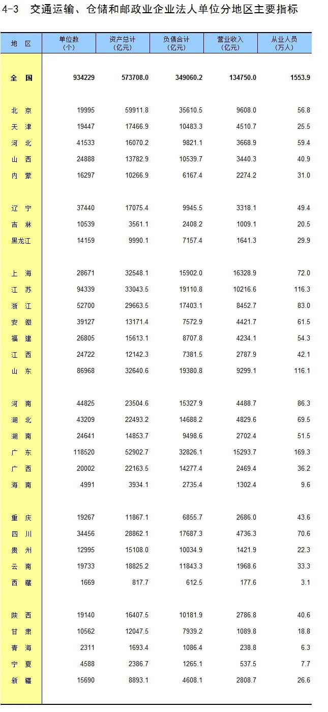 4-3 交通运输、仓储和邮政业企业法人单位分地区主要指标