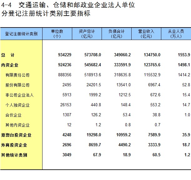 4-4 交通运输、仓储和邮政业企业法人单位分登记注册统计类别主要指标