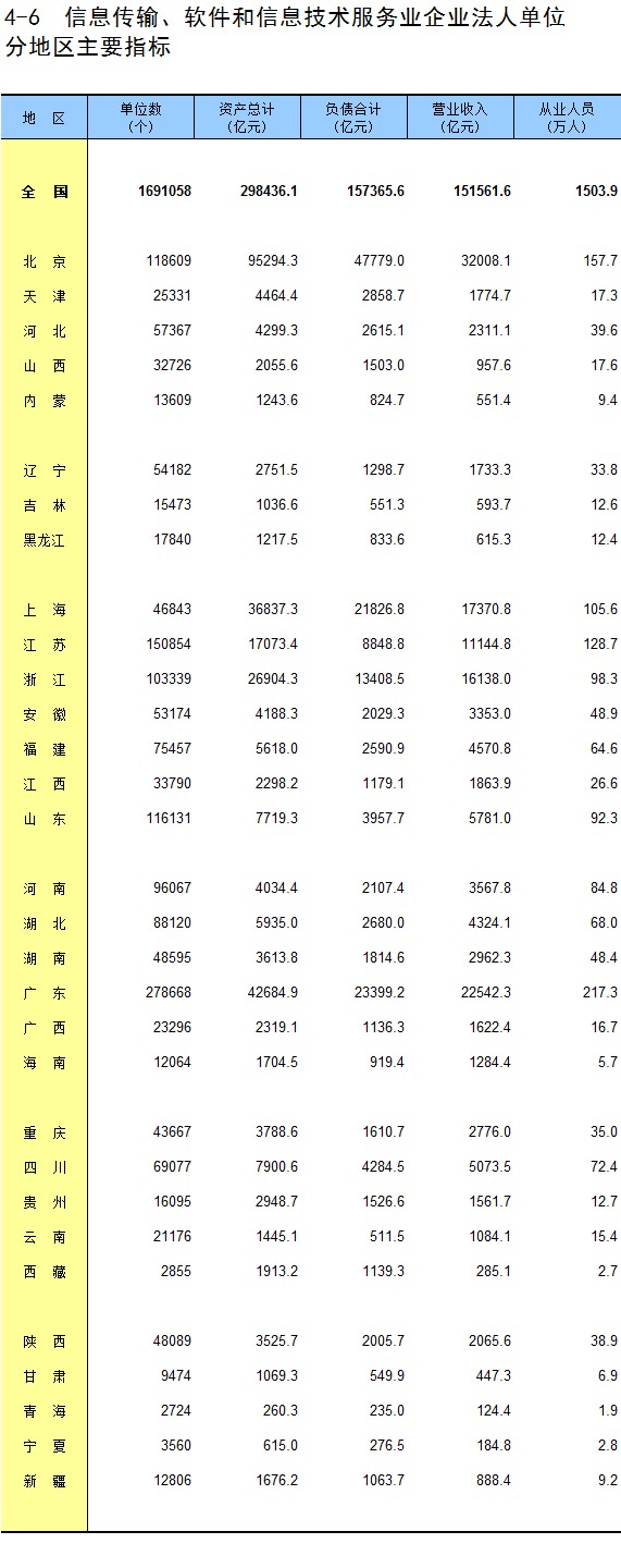 4-6 信息传输、软件和信息技术服务业企业法人单位分地区主要指标