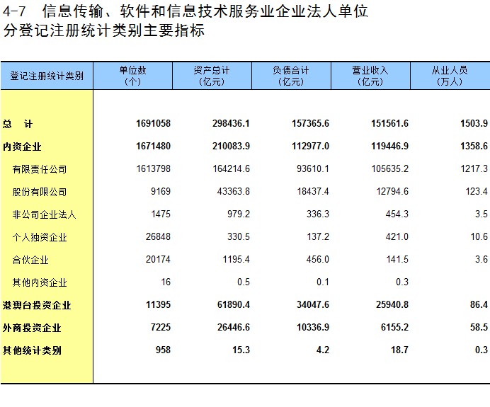4-7 信息传输、软件和信息技术服务业企业法人单位分登记注册统计类别主要指标