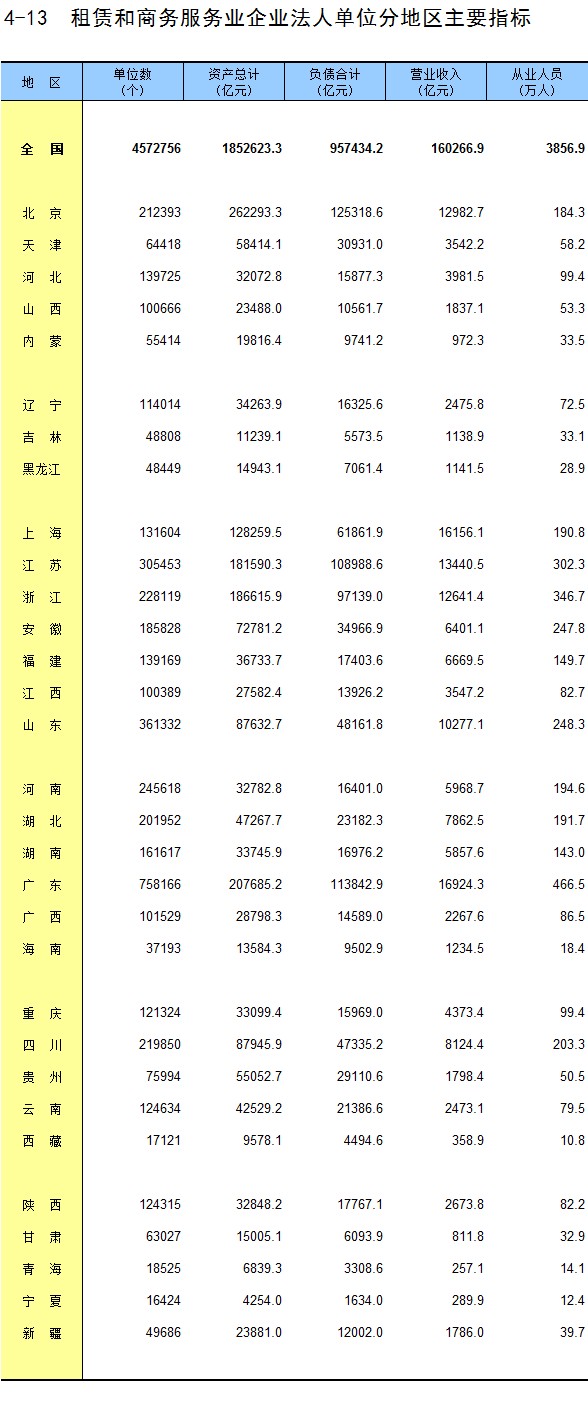 4-13 租赁和商务服务业企业法人单位分地区主要指标