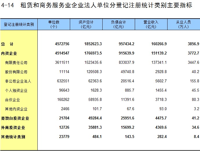 4-14 租赁和商务服务业企业法人单位分登记注册统计类别主要指标