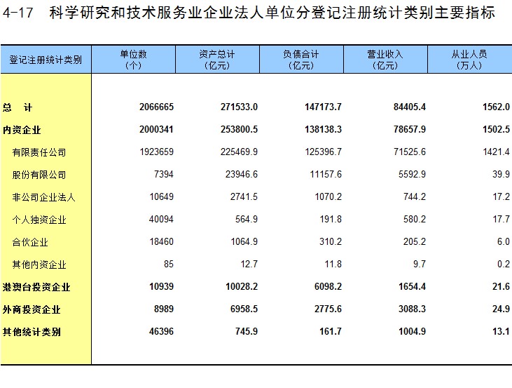 4-17 科学研究和技术服务业企业法人单位分登记注册统计类别主要指标