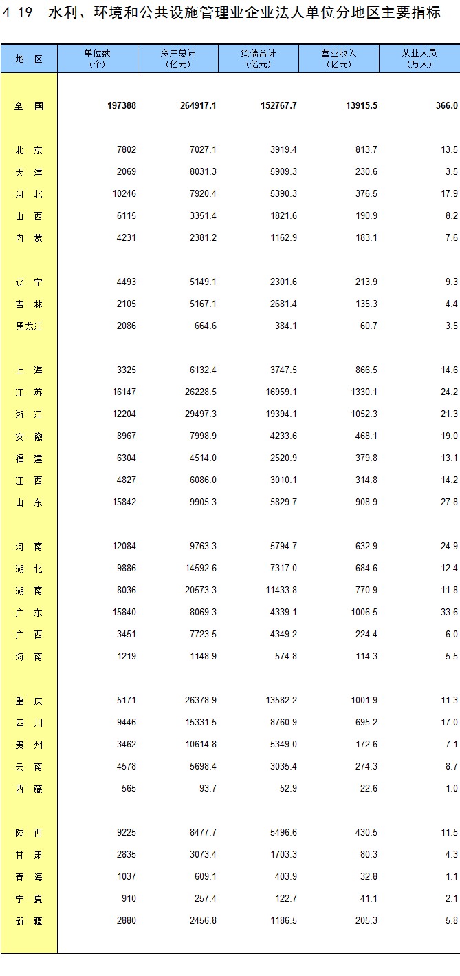 4-19 水利、环境和公共设施管理业企业法人单位分地区主要指标