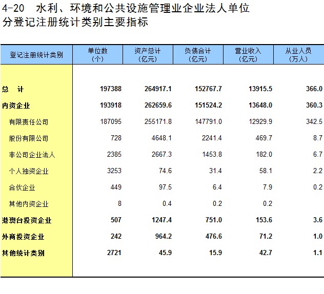4-20 水利、环境和公共设施管理业企业法人单位分登记注册统计类别主要指标