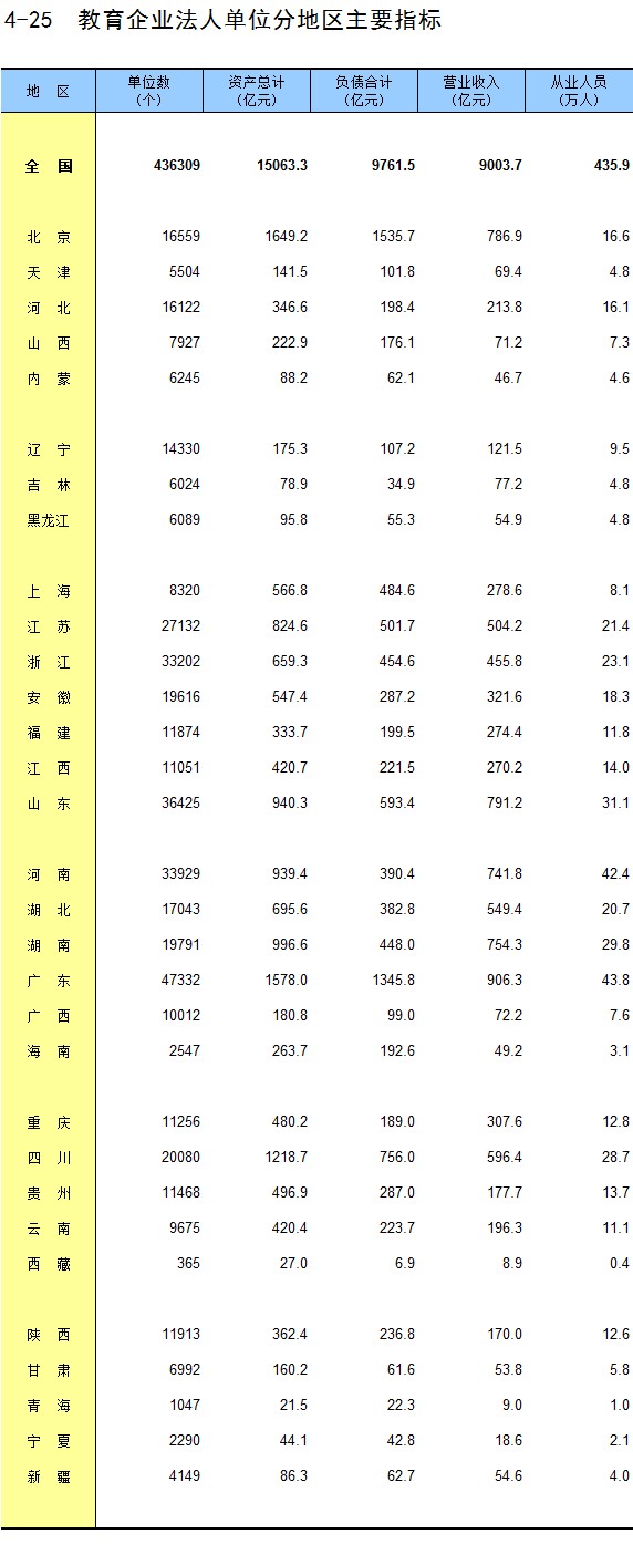 4-25 教育企业法人单位分地区主要指标