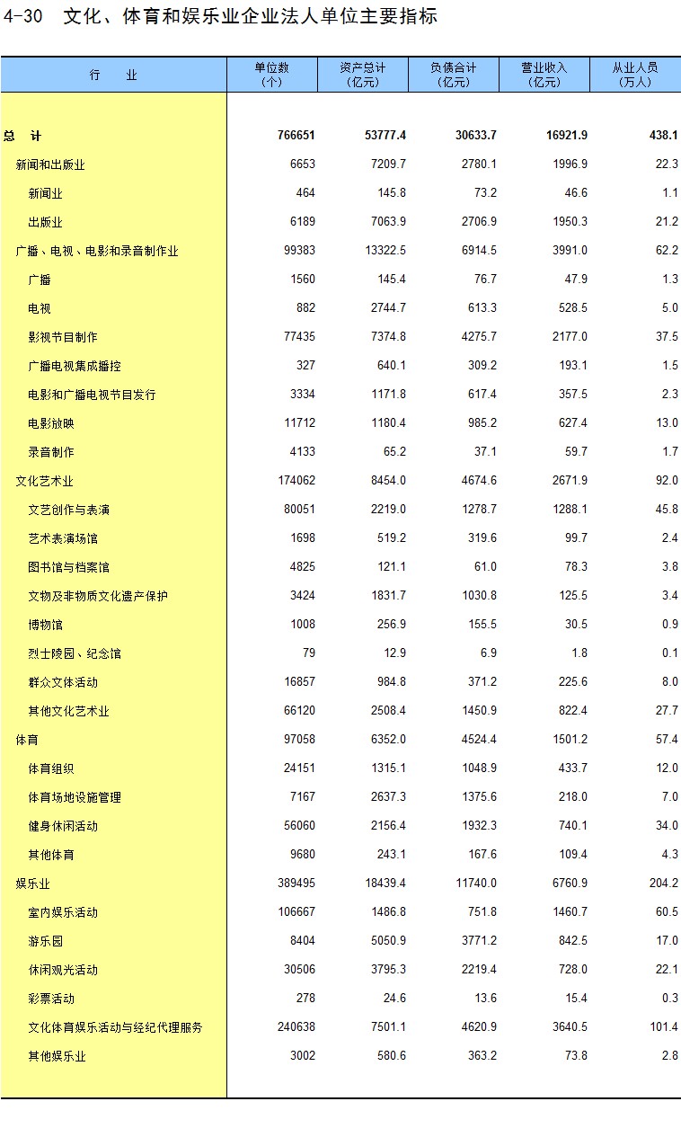 4-30 文化、体育和娱乐业企业法人单位主要指标