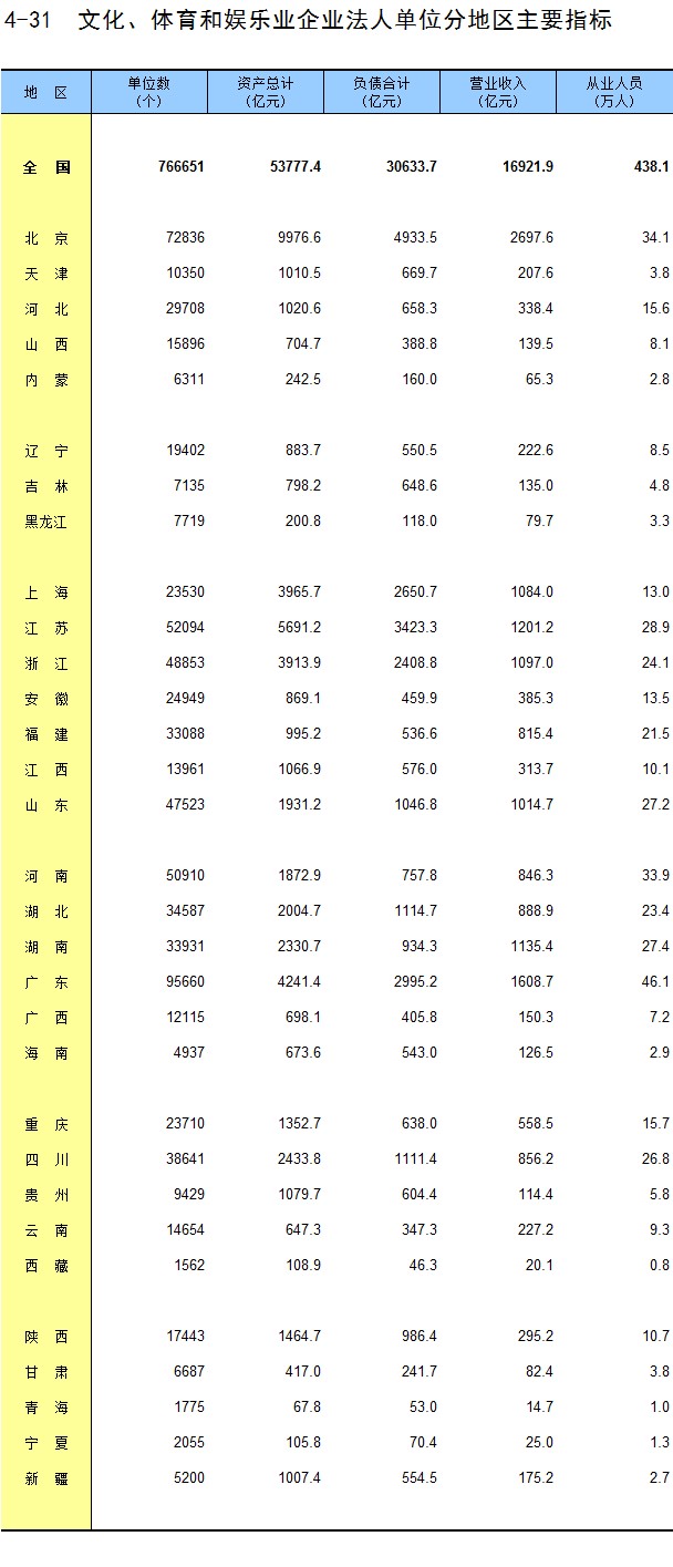 4-31 文化、体育和娱乐业企业法人单位分地区主要指标