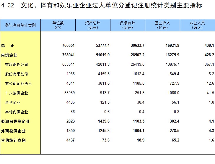 4-32 文化、体育和娱乐业企业法人单位分登记注册统计类别主要指标