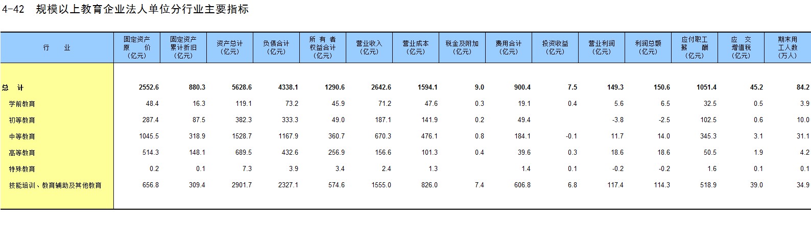 4-42 规模以上教育企业法人单位分行业主要指标