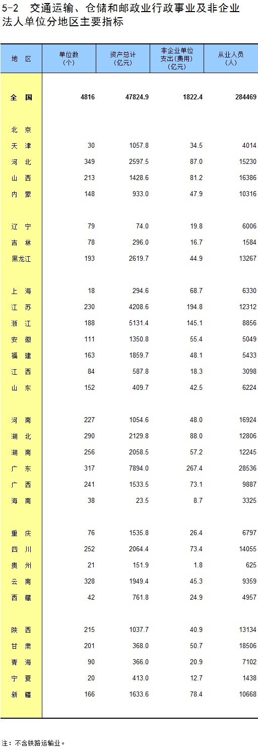 5-2 交通运输、仓储和邮政业行政事业及非企业法人单位分地区主要指标