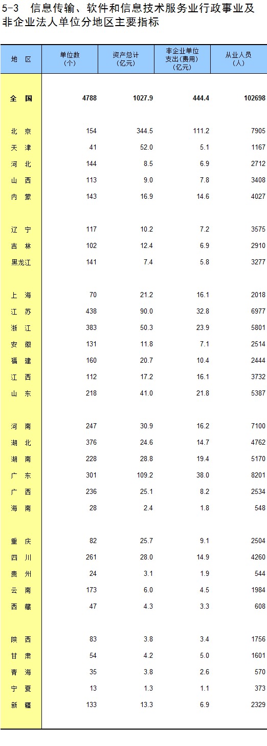 5-3 信息传输、软件和信息技术服务业行政事业及非企业法人单位分地区主要指标