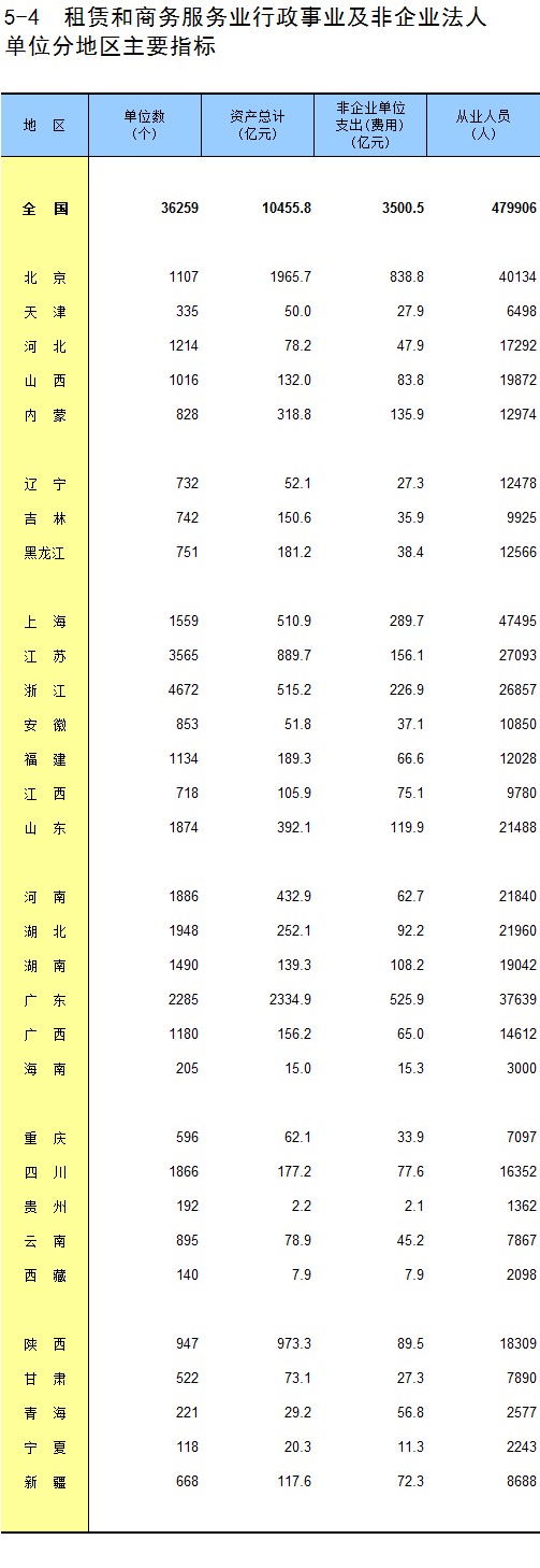 5-4 租赁和商务服务业行政事业及非企业法人单位分地区主要指标