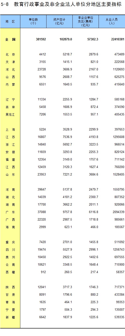 5-8 教育行政事业及非企业法人单位分地区主要指标
