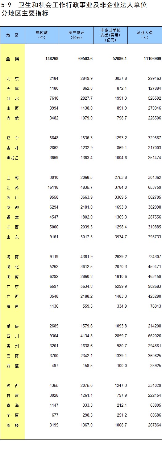 5-9 卫生和社会工作行政事业及非企业法人单位分地区主要指标