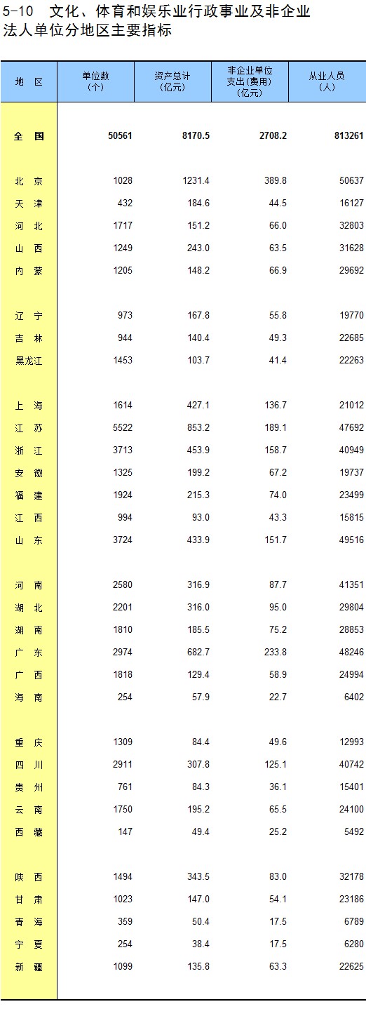 5-10 文化、体育和娱乐业行政事业及非企业法人单位分地区主要指标