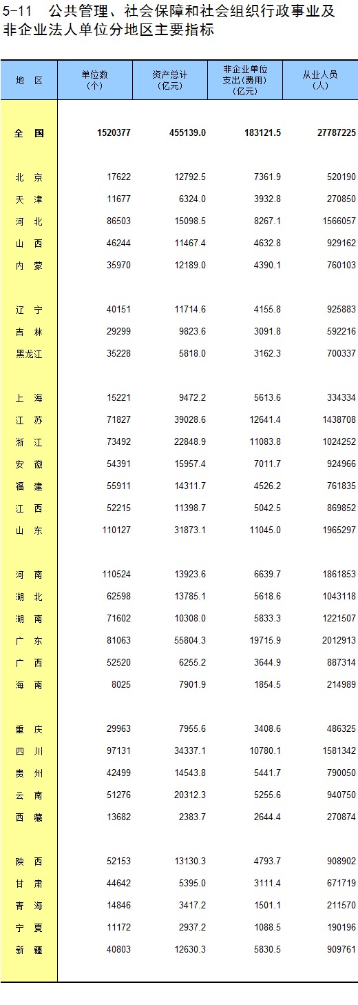 5-11 公共管理、社会保障和社会组织行政事业及非企业法人单位分地区主要指标