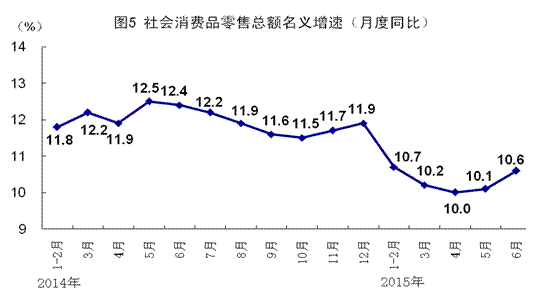 上半年,社会消费品零售总额141577亿元,同比名义增长10.4%(扣除价格因素实际增长10.5%),增速比一季度回落0.2个百分点。其中,限额以上单位消费品零售额66256亿元,增长7.4%。按经营单位所在地分,城镇消费品零售额121850亿元,同比增长10.2%,乡村消费品零售额19727亿元,增长11.6%。按消费形态分,餐饮收入14996亿元,同比增长11.5%,商品零售126581亿元,增长10.3%,其中限额以上单位商品零售62306亿元,增长7.4%。6月份,社会消费品零售总额同比名义增长10.6%(扣除价格因素实际增长10.6%),增速比5月份加快0.5个百分点,环比增长0.96%。