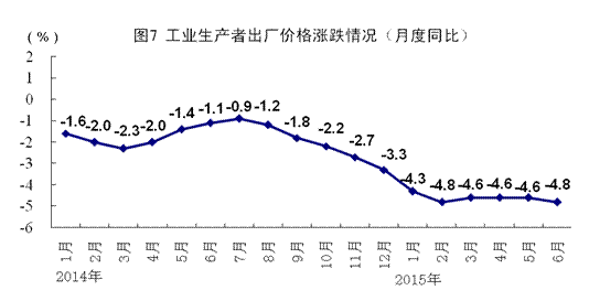 上半年,居民消费价格同比上涨1.3%,涨幅比一季度扩大0.1个百分点。其中,城市上涨1.3%,农村上涨1.1%。分类别看,食品价格同比上涨2.0%,烟酒及用品上涨0.5%,衣着上涨2.9%,家庭设备用品及维修服务上涨1.1%,医疗保健和个人用品上涨1.8%,交通和通信下降1.6%,娱乐教育文化用品及服务上涨1.5%,居住上涨0.7%。在食品价格中,粮食价格上涨2.6%,油脂价格下降4.4%,猪肉价格上涨2.4%,鲜菜价格上涨4.6%。6月份,居民消费价格同比上涨1.4%,环比持平。上半年,工业生产者出厂价格同比下降4.6%,6月份同比下降4.8%,环比下降0.4%。上半年,工业生产者购进价格同比下降5.5%,6月份同比下降5.6%,环比下降0.2%。