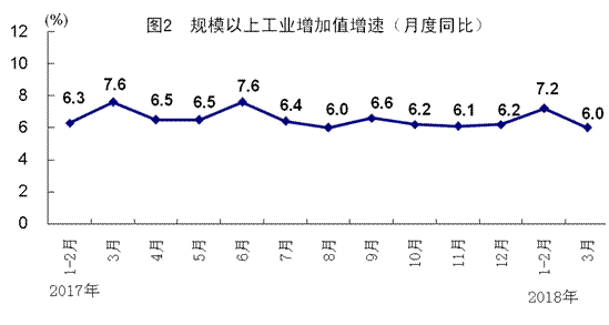 一季度,全国规模以上工业增加值同比实际增长6.8%,增速比1-2月份回落 0.4个百分点,与上年同期持平。分经济类型看,国有控股企业增加值增长7.9%,集体企业增长0.1%,股份制企业增长7.0%,外商及港澳台商投资企业增长5.5%。分三大门类看,采矿业增加值同比增长0.9%,制造业增长7.0%,电力、热力、燃气及水生产和供应业增长10.8%。新行业新产品迅速发展。高技术产业和装备制造业增加值同比分别增长11.9%和8.8%,分别快于规模以上工业5.1和2.0个百分点。集成电路产量同比增长15.2%,新能源汽车增长139.4%,工业机器人增长29.6%。规模以上工业企业产销率达到97.9%,比上年同期提高0.3个百分点。3月份,规模以上工业增加值同比增长6.0%,环比增长0.33%。3月份,制造业采购经理指数为51.5%,比上月提高1.2个百分点。