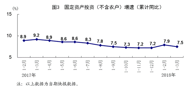 一季度,全国固定资产投资(不含农户)100763亿元,同比增长7.5%,增速比1-2月份回落0.4个百分点,比上年同期回落1.7个百分点。其中,民间投资62386亿元,增长8.9%,比1-2月份加快0.8个百分点,比上年同期加快1.2个百分点。分产业看,第一产业投资2900亿元,增长24.2%;第二产业投资35813亿元,增长2.0%,其中制造业投资增长3.8%;第三产业投资62050亿元,增长10.0%,其中基础设施投资增长13.0%。高技术制造业投资同比增长7.9%,增速比全部投资快0.4个百分点。从环比看,3月份固定资产投资(不含农户)比上月增长0.57%。
