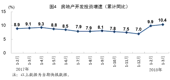 一季度,全国房地产开发投资21291亿元,同比增长10.4%,增速比1-2月份加快0.5个百分点,比上年同期加快1.3个百分点,其中住宅投资增长13.3%。房屋新开工面积34615万平方米,同比增长9.7%,其中住宅新开工面积增长12.2%。全国商品房销售面积30088万平方米,增长3.6%,其中住宅销售面积增长2.5%。全国商品房销售额25597亿元,增长10.4%,其中住宅销售额增长11.4%。房地产开发企业土地购置面积3802万平方米,同比增长0.5%。3月末,全国商品房待售面积57329万平方米,比上月末减少1138万平方米。一季度,房地产开发企业到位资金36770亿元,同比增长3.1%。