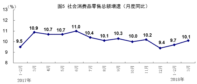 一季度,社会消费品零售总额90275亿元,同比增长9.8%,增速比1-2月份加快0.1个百分点,比上年同期回落0.2个百分点。按经营单位所在地分,城镇消费品零售额77096亿元,增长9.7%;乡村消费品零售额13179亿元,增长10.7%。按消费类型分,餐饮收入9711亿元,增长10.3%;商品零售80564亿元,增长9.8%。消费升级类商品销售增长较快,限额以上单位化妆品类、家用电器和音像器材类商品同比分别增长16.1%和11.4%,分别比上年同期加快6.2和3.4个百分点。3月份,社会消费品零售总额同比增长10.1%,比1-2月份加快0.4个百分点,环比增长0.73%。