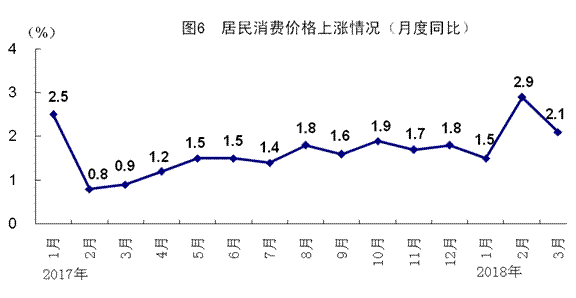 一季度,全国居民消费价格同比上涨2.1%,涨幅比1-2月份回落0.1个百分点,比上年同期扩大0.7个百分点。其中,城市上涨2.2%,农村上涨2.0%。分类别看,食品烟酒价格同比上涨1.9%,衣着上涨1.2%,居住上涨2.4%,生活用品及服务上涨1.6%,交通和通信上涨0.7%,教育文化和娱乐上涨2.2%,医疗保健上涨6.0%,其他用品和服务上涨1.4%。在食品烟酒价格中,粮食价格上涨1.1%,猪肉价格下降9.9%,鲜菜价格上涨6.6%。3月份,全国居民消费价格同比上涨2.1%,涨幅比上月回落0.8个百分点,环比下降1.1%。