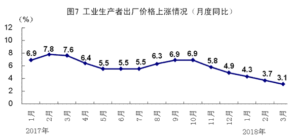 一季度,全国工业生产者出厂价格同比上涨3.7%,涨幅比1-2月份回落0.3个百分点,比上年同期回落3.7个百分点。3月份,全国工业生产者出厂价格同比上涨3.1%,涨幅比上月回落0.6个百分点,环比下降0.2%。一季度,全国工业生产者购进价格同比上涨4.4%;3月份同比上涨3.7%,环比下降0.3%。