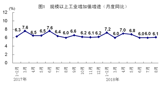 8月份,全国规模以上工业增加值同比实际增长6.1%,增速比上月加快0.1个百分点;1-8月份,全国规模以上工业增加值同比增长6.5%,增速比1-7月份回落0.1个百分点。分经济类型看,8月份,国有控股企业增加值同比增长5.6%,集体企业下降1.2%,股份制企业增长6.4%,外商及港澳台商投资企业增长4.9%。分三大门类看,8月份,采矿业增加值同比增长2.0%,制造业增长6.1%,电力、热力、燃气及水生产和供应业增长9.9%。工业发展继续迈向中高端。1-8月份,高技术制造业、装备制造业和战略性新兴产业同比分别增长11.9%、8.8%和8.8%,分别快于规模以上工业5.4、2.3和2.3个百分点。工业新产品快速成长。1-8月份,新能源汽车、工业机器人、集成电路产量同比分别增长56.0%、19.4%和13.4%。企业利润较快增长。1-7月份,全国规模以上工业企业实现利润总额39038亿元,同比增长17.1%;主营业务收入利润率为6.46%,比上年同期提高0.4个百分点。