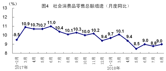8月份,社会消费品零售总额31542亿元,同比增长9.0%,增速比上月加快0.2个百分点;1-8月份,社会消费品零售总额同比增长9.3%,增速与1-7月份持平。按经营单位所在地分,8月份,城镇消费品零售额27169亿元,同比增长8.8%;乡村消费品零售额4373亿元,增长10.2%。按消费类型分,8月份,餐饮收入3516亿元,增长9.7%;商品零售28026亿元,增长8.9%。升级类商品销售增长较快。1-8月份,限额以上单位商品零售额中,化妆品类、家具类商品零售额同比分别增长12.6%和10.2%,增速分别比社会消费品零售总额快3.3和0.9个百分点。新消费发展较快。1-8月份,全国网上零售额55195亿元,同比增长28.2%。其中,实物商品网上零售额41993亿元,增长28.6%,占社会消费品零售总额的比重为17.3%,比上年同期提高3.5个百分点;非实物商品网上零售额13202亿元,增长27.2%。