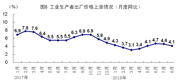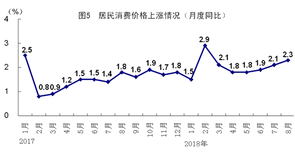 8月份,全国居民消费价格同比上涨2.3%,涨幅比上月扩大0.2个百分点,环比上涨0.7%。分类别看,食品烟酒价格同比上涨1.9%,衣着上涨1.3%,居住上涨2.5%,生活用品及服务上涨1.6%,交通和通信上涨2.7%,教育文化和娱乐上涨2.6%,医疗保健上涨4.3%,其他用品和服务上涨1.2%。1-8月份,全国居民消费价格同比上涨2.0%。8月份,全国工业生产者出厂价格同比上涨4.1%,涨幅比上月回落0.5个百分点,环比上涨0.4%;工业生产者购进价格同比上涨4.8%,环比上涨0.5%。1-8月份,全国工业生产者出厂价格同比上涨4.0%,工业生产者购进价格同比上涨4.5%。