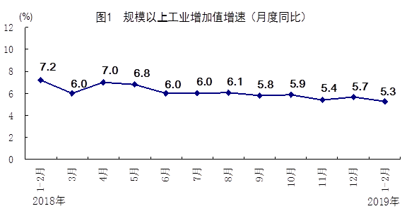 1-2月份,全国规模以上工业增加值同比增长5.3%,增速比上年12月份回落0.4个百分点。据测算,剔除春节因素,1-2月份全国规模以上工业增加值同比增长6.1%。从环比看,2月份全国规模以上工业增加值比上月增长0.43%。1-2月份,分经济类型看,国有控股企业增加值同比增长4.4%,股份制企业增长6.4%,外商及港澳台商投资企业下降0.3%。分三大门类看,采矿业增加值同比增长0.3%,制造业增长5.6%,电力、热力、燃气及水生产和供应业增长6.8%。战略性新兴产业增加值同比增长10.1%,增速快于全部规模以上工业4.8个百分点。新能源汽车产量同比增长53.3%,比上年12月份提高37.8个百分点;太阳能电池产量增长13.5%,提高0.4个百分点。1-2月份,发电量同比增长2.9%,2月份增长6.8%。2月份,制造业采购经理指数中新订单指数为50.6%,比上月上升1.0个百分点,市场预期出现向好趋势。