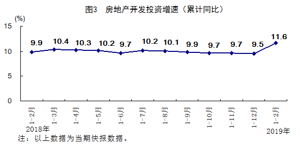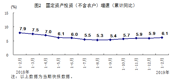 1-2月份,全国固定资产投资(不含农户)44849亿元,同比增长6.1%,增速比上年全年加快0.2个百分点。其中,民间投资26963亿元,增长7.5%。分产业看,第一产业投资同比增长3.7%;第二产业投资增长5.5%,其中制造业投资增长5.9%;第三产业投资增长6.5%,增速比上年全年加快1.0个百分点,其中基础设施投资增长4.3%。高技术产业投资、工业技术改造投资同比分别增长8.6%和19.5%,增速分别快于全部投资2.5和13.4个百分点。1-2月份,全国房地产开发投资12090亿元,同比增长11.6%;全国商品房销售面积14102万平方米,下降3.6%;全国商品房销售额12803亿元,增长2.8%。从环比看,2月份固定资产投资比上月增长0.43%。