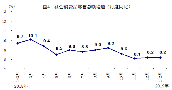 1-2月份,社会消费品零售总额66064亿元,同比增长8.2%,增速与上年12月份持平。按经营单位所在地分,城镇消费品零售额56210亿元,同比增长8.0%;乡村消费品零售额9854亿元,增长9.1%。按消费类型分,餐饮收入7251亿元,增长9.7%;商品零售58813亿元,增长8.0%。升级类商品消费增速较快。1-2月份,限额以上单位商品零售额中,书报杂志类、化妆品类、文化办公用品类同比分别增长33.9%、8.9%和8.8%,增速分别比社会消费品零售总额快25.7、0.7和0.6个百分点。1-2月份,全国网上零售额13983亿元,同比增长13.6%。其中,实物商品网上零售额10901亿元,增长19.5%,占社会消费品零售总额的比重为16.5%,比上年同期提高1.6个百分点。从环比看,2月份社会消费品零售总额比上月增长0.81%。